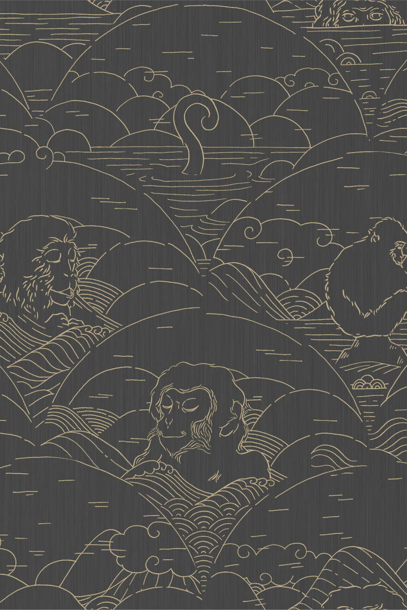 Moooi Indigo Macaque wallpaper with monkeys is a unique wallcovering. The pattern on the Indigo Macaque wallcovering shows a cheerful scene of Indigo Macaque monkey families, bathing in a relaxing atmosphere at their favorite place: the hot springs at the foot of the Japanese mountains.